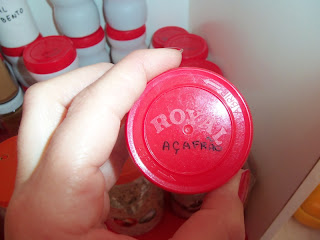 Sabe por que prefiro em potinhos de plástico, é porque nos de vidro eles recebem a luz e mudam a coloração e ficam tipo umedecidos e estragam fácil, o sal e o tempero pronto ficam neste de maionese, por que se o sal ficar no saleiro ele umedece e enferruja a dobradiça da porta do armário(assim bem tapado ele fica sequinho e soltinho) e nos potinhos como são todos iguais eu escrevi na tampa com caneta pra cds,(tenho que fazer algo mais bonitinho, talvez por uns adesivos...